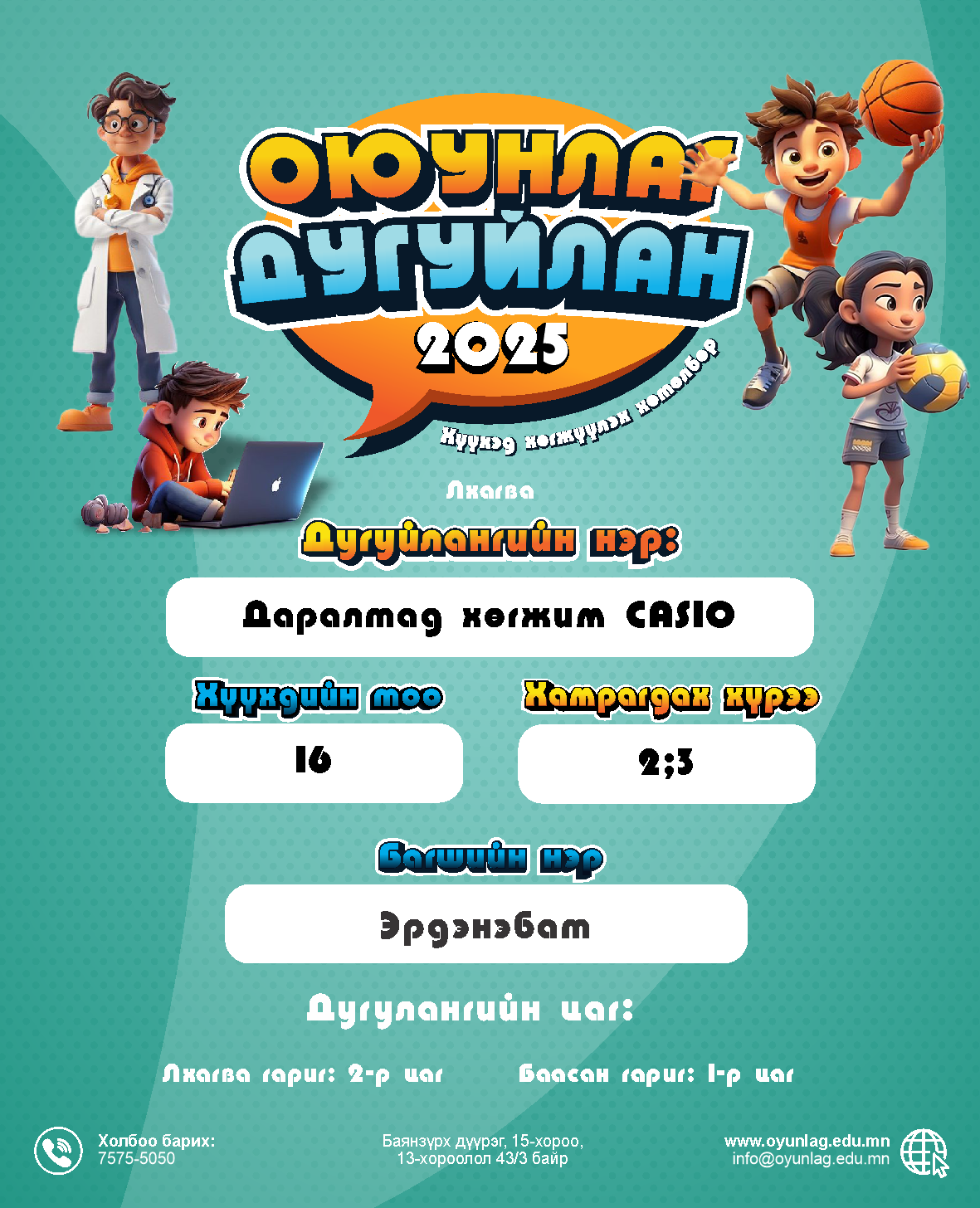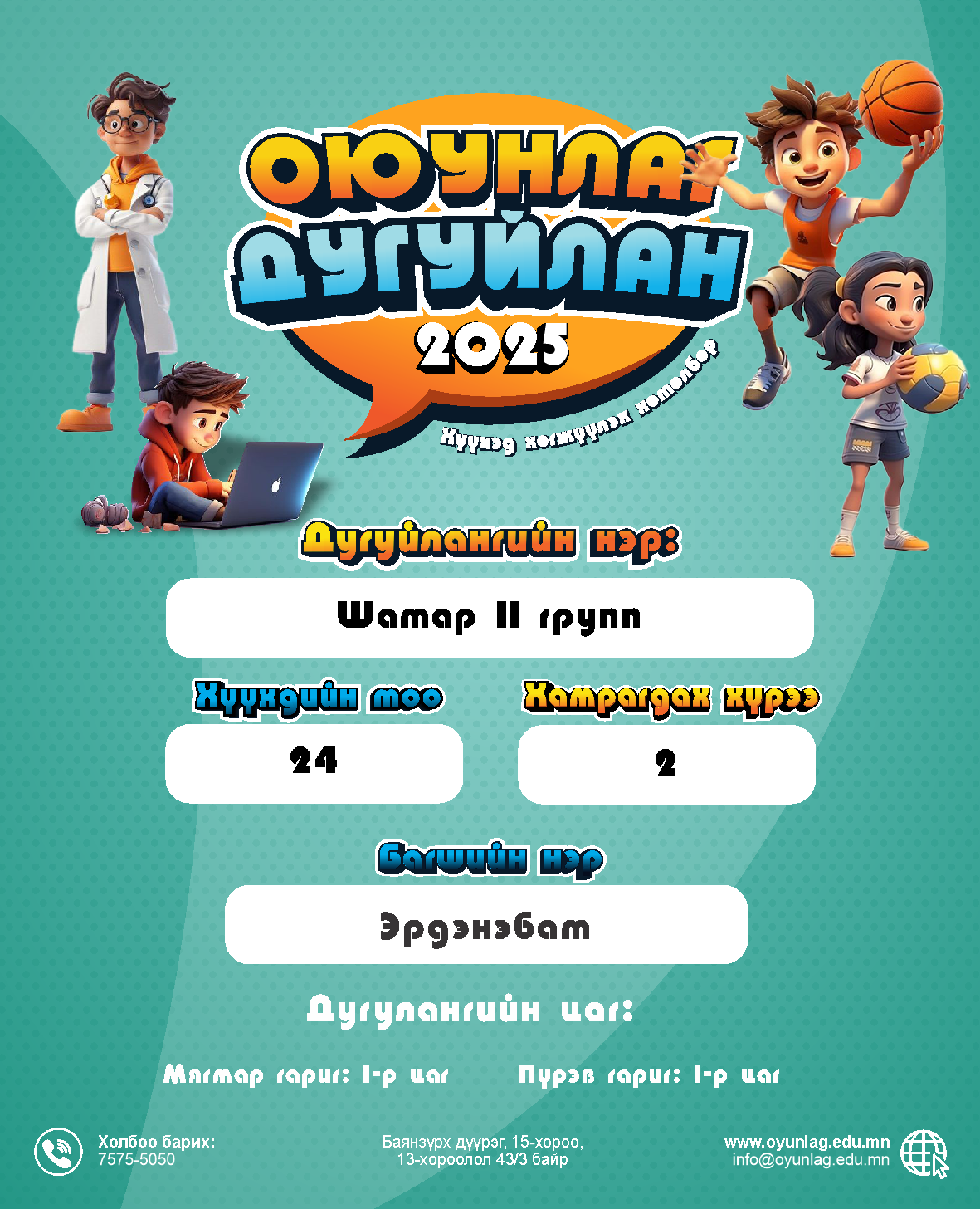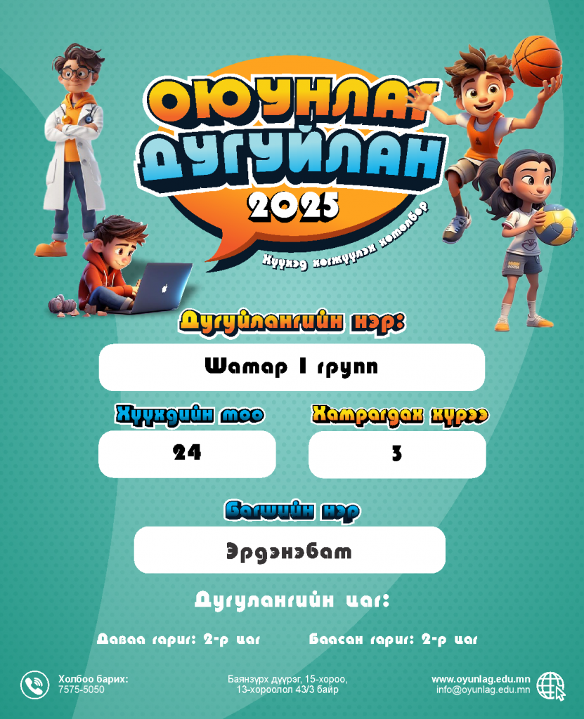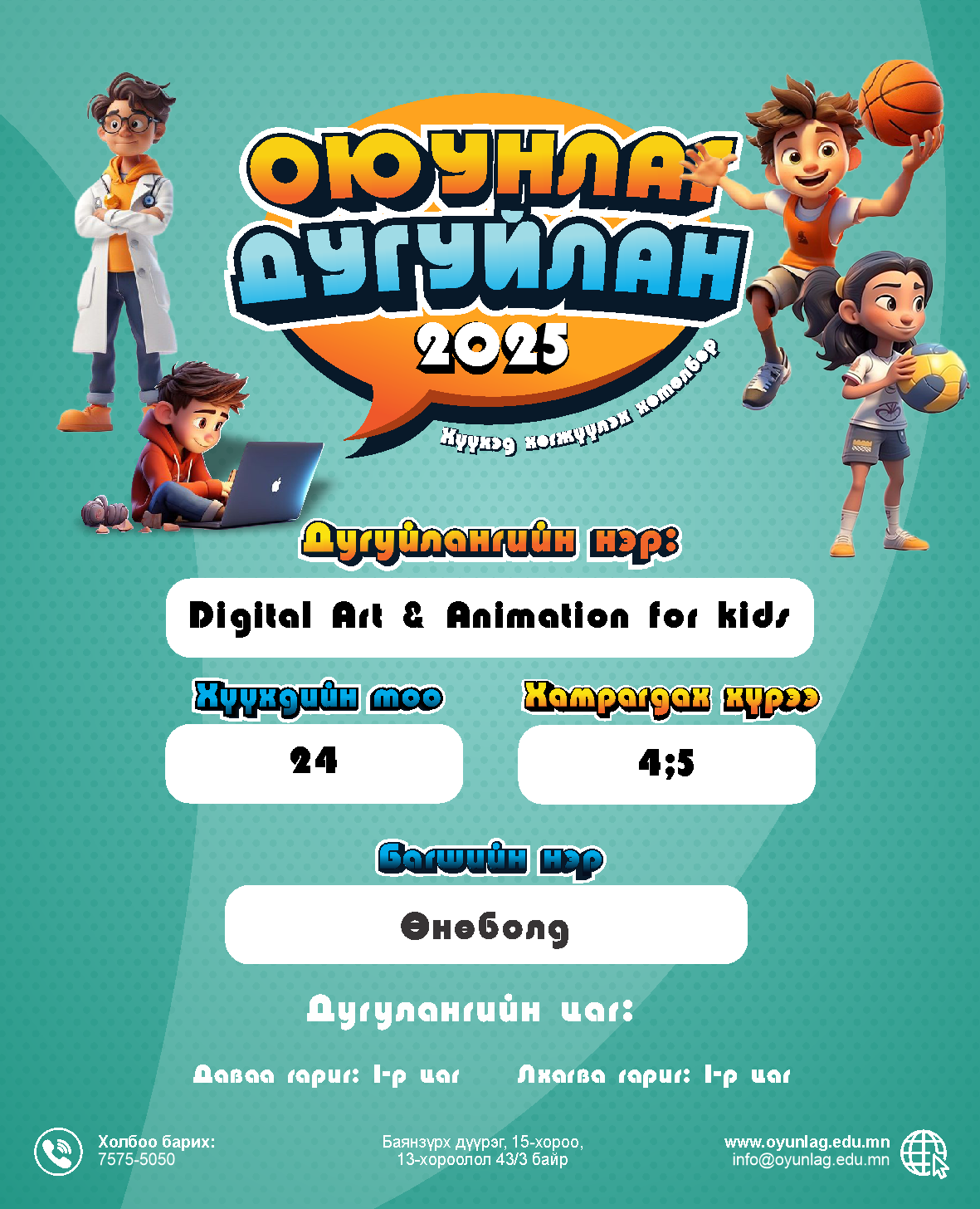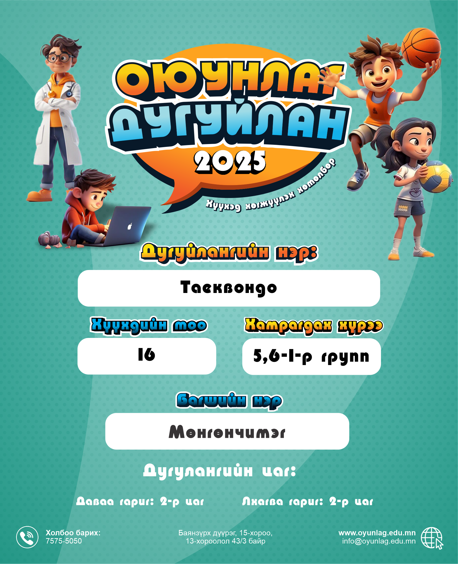 Үндэсний хөтөлбөрийн хичээлүүд : Математик, Монгол хэл , Хүн орчин , Хүн байгаль , Биеийн тамир, , Зураг , Дуу хөгжим